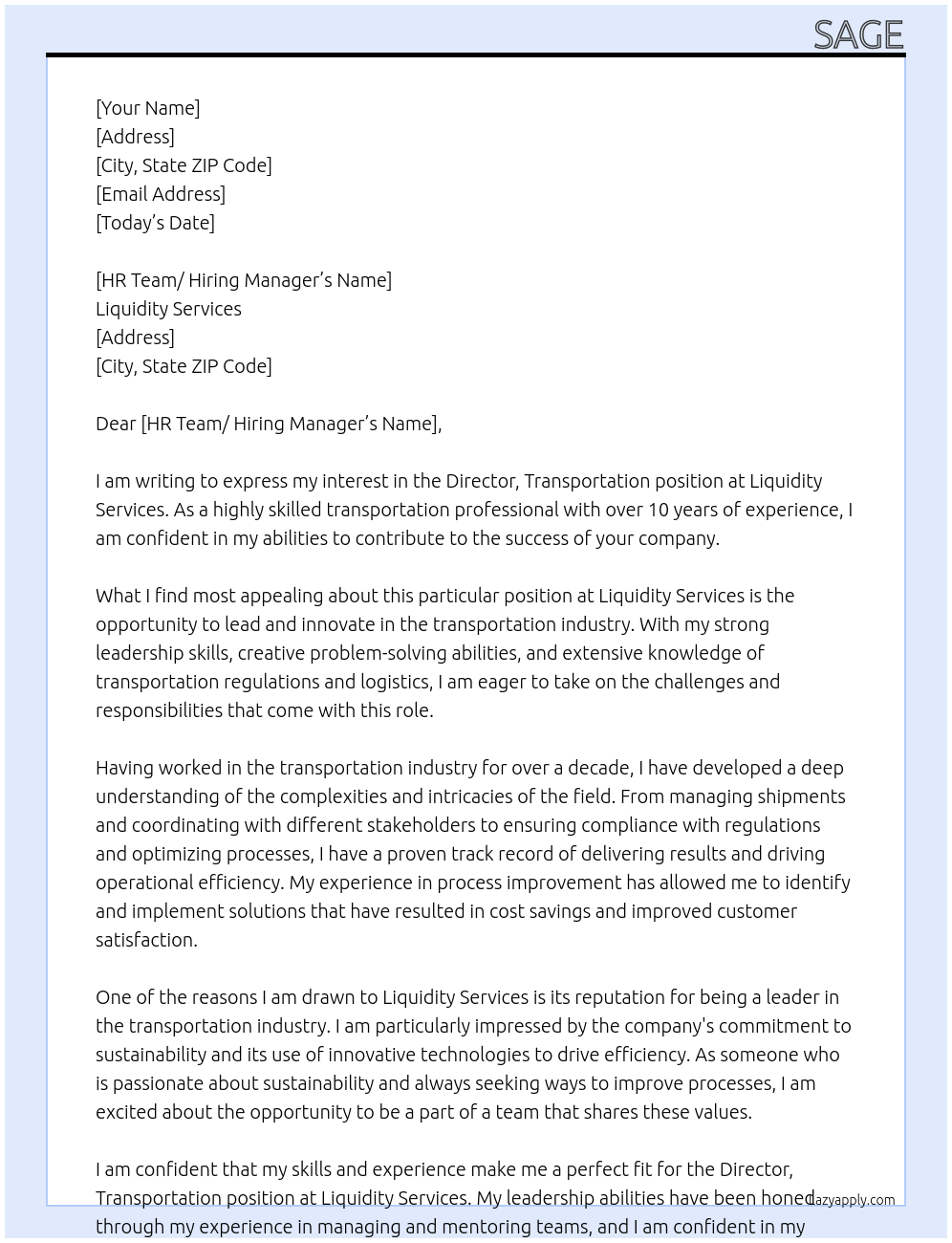 Check out these director, transportation cover letter sample and examples previously used by job seekers to land on job interviews as director, transportation. Use our AI cover letter generator to create a personalized cover letter as director, transportation.