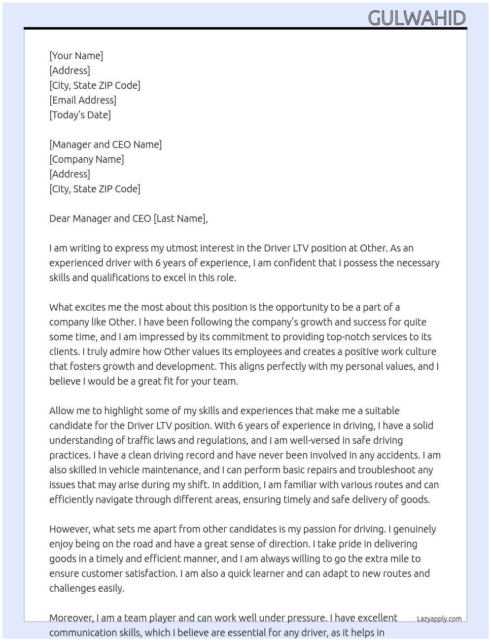 Check out these driver ltv cover letter sample and examples previously used by job seekers to land on job interviews as driver ltv. Use our AI cover letter generator to create a personalized cover letter as driver ltv.