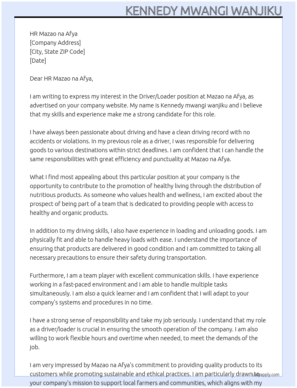 Check out these driver/loader cover letter sample and examples previously used by job seekers to land on job interviews as driver/loader. Use our AI cover letter generator to create a personalized cover letter as driver/loader.