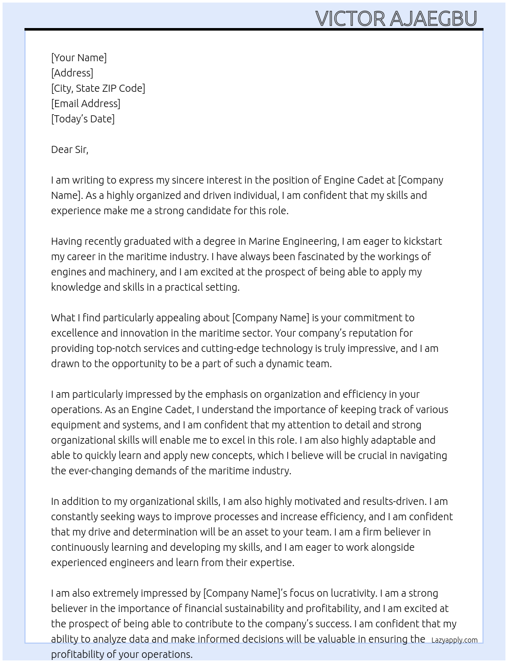 Check out these engine cadet cover letter sample and examples previously used by job seekers to land on job interviews as engine cadet. Use our AI cover letter generator to create a personalized cover letter as engine cadet.
