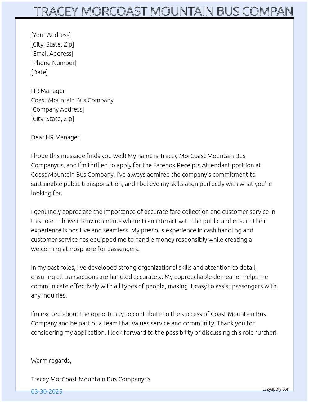 Farebox Receipts Attendant - PTT Cover Letter At Coast Mountain Bus Company