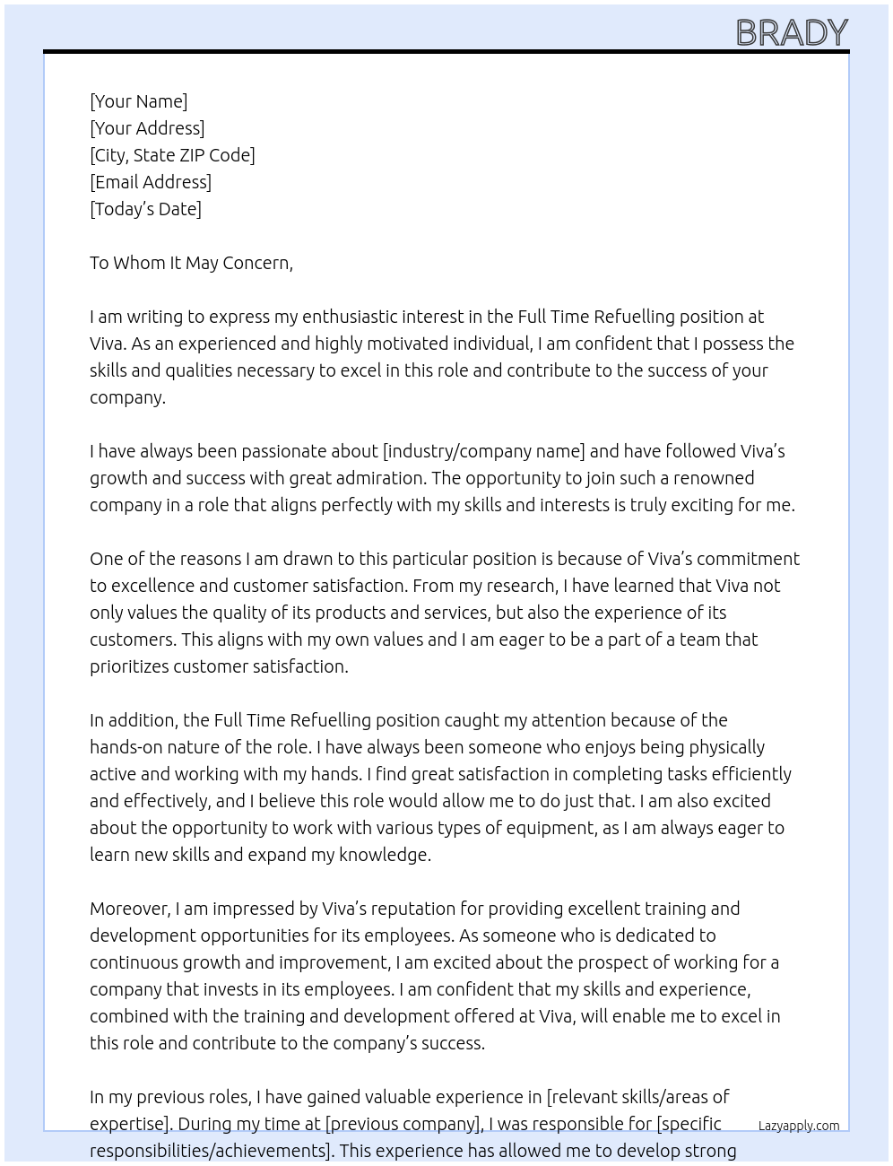 Full time refuelling position Cover Letter At Viva