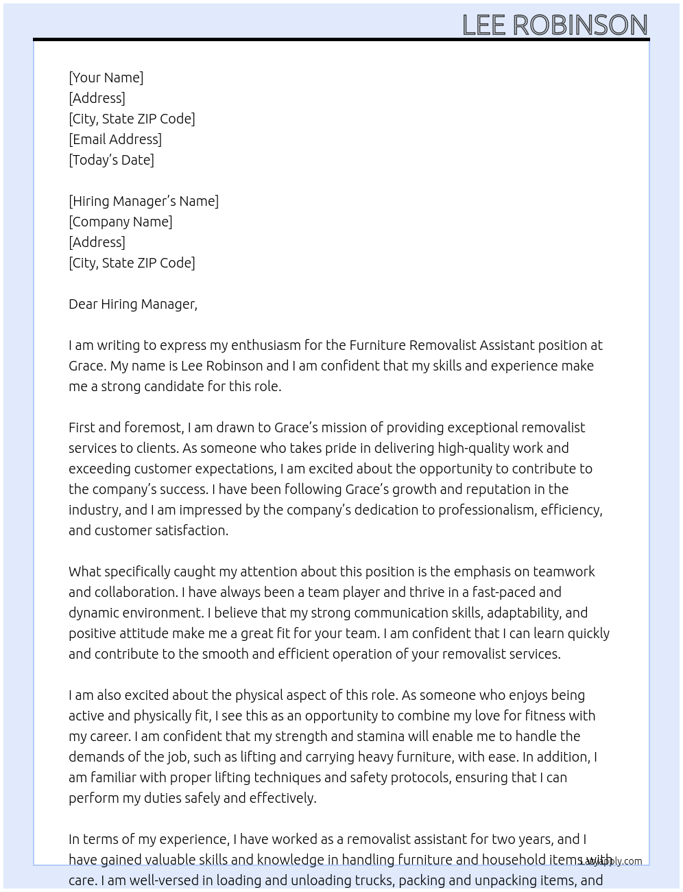 Furniture Removalist Assistant Cover Letter Examples And Template