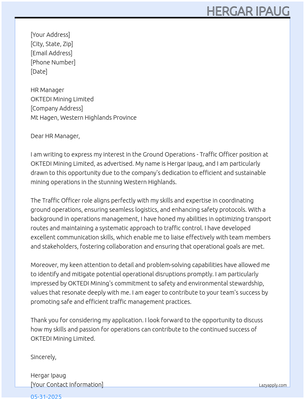 Ground Operations -Traffic Officer Cover Letter At OKTEDI Mining Limited