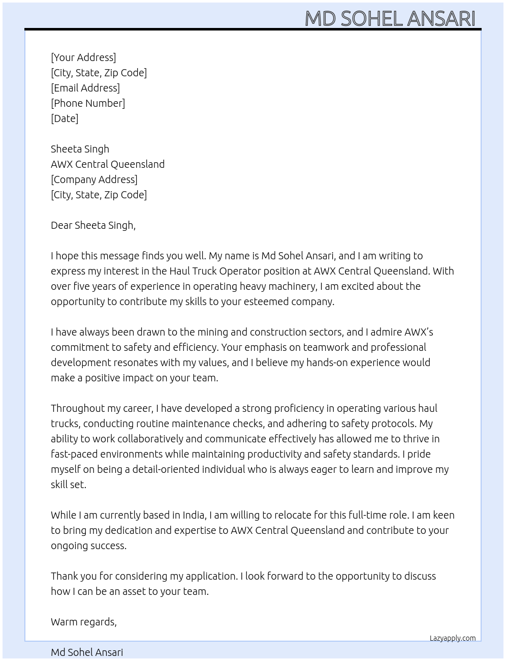 Check out these haul truck oprator cover letter sample and examples previously used by job seekers to land on job interviews as haul truck oprator. Use our AI cover letter generator to create a personalized cover letter as haul truck oprator.