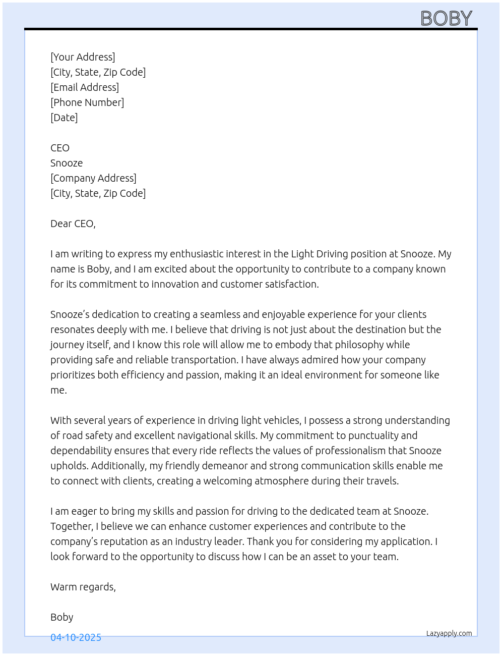 Check out these light driving cover letter sample and examples previously used by job seekers to land on job interviews as light driving. Use our AI cover letter generator to create a personalized cover letter as light driving.