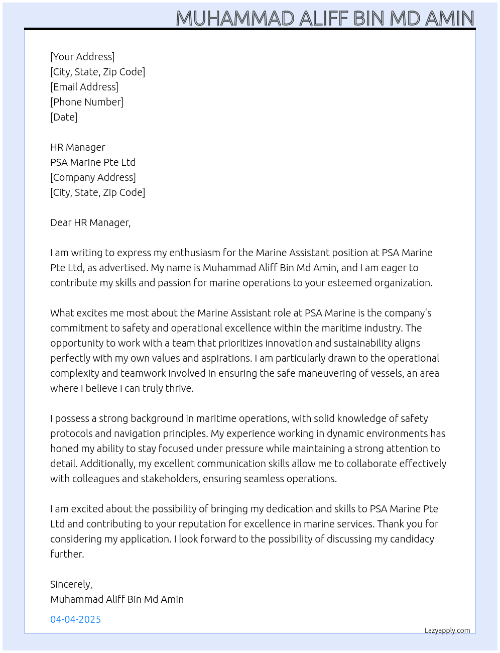 Marine Assistant Cover Letter At PSA MARINE PTE LTD