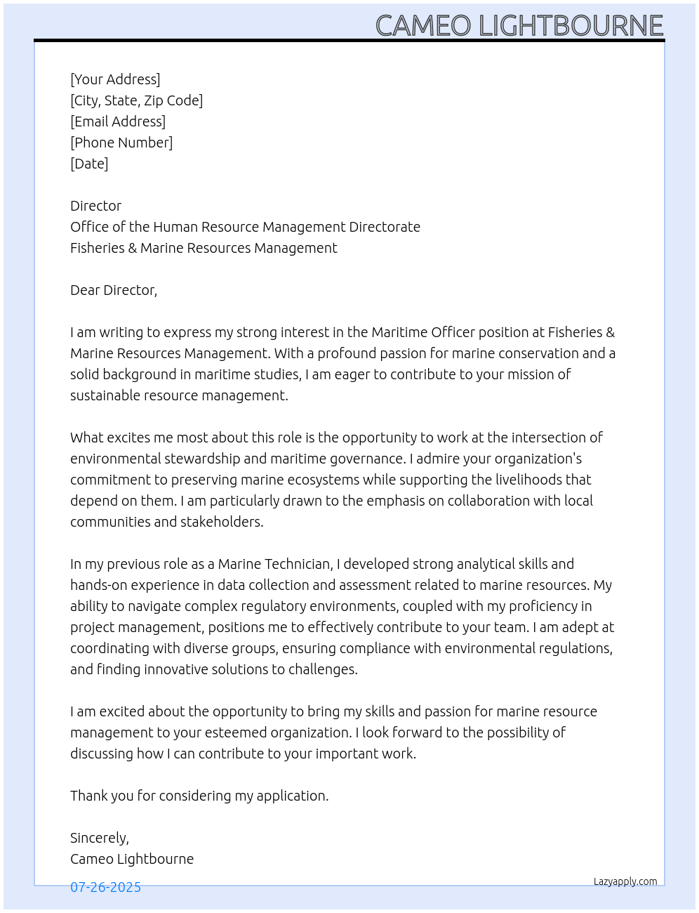 Maritime Officer Cover Letter At Fisheries & Marine Resources Management