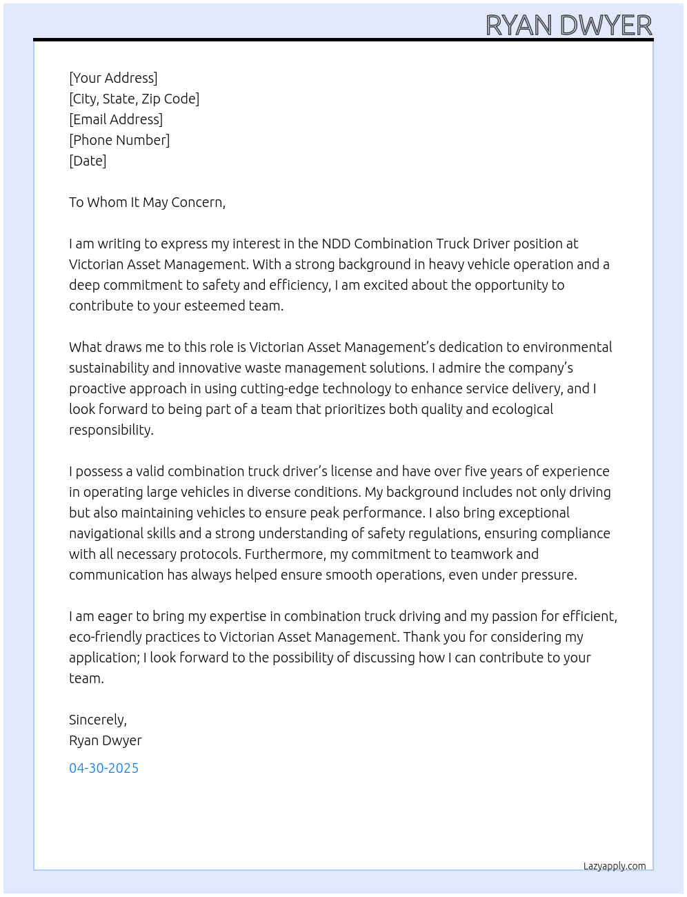 NDD Combination Truck Driver Cover Letter At Victorian Asset Management