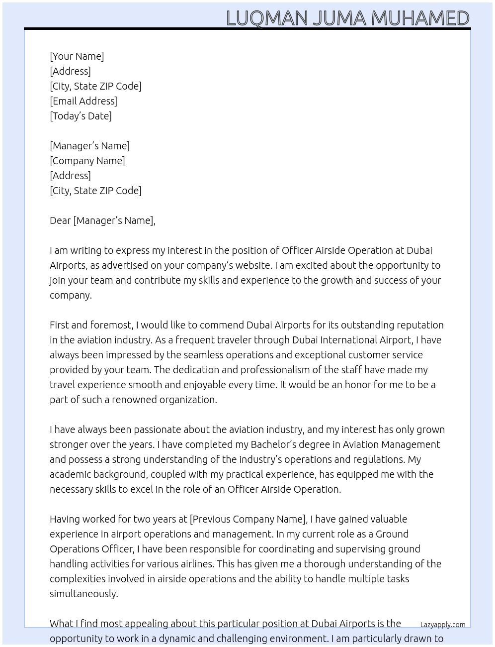 Check out these officer airside operation cover letter sample and examples previously used by job seekers to land on job interviews as officer airside operation. Use our AI cover letter generator to create a personalized cover letter as officer airside operation.