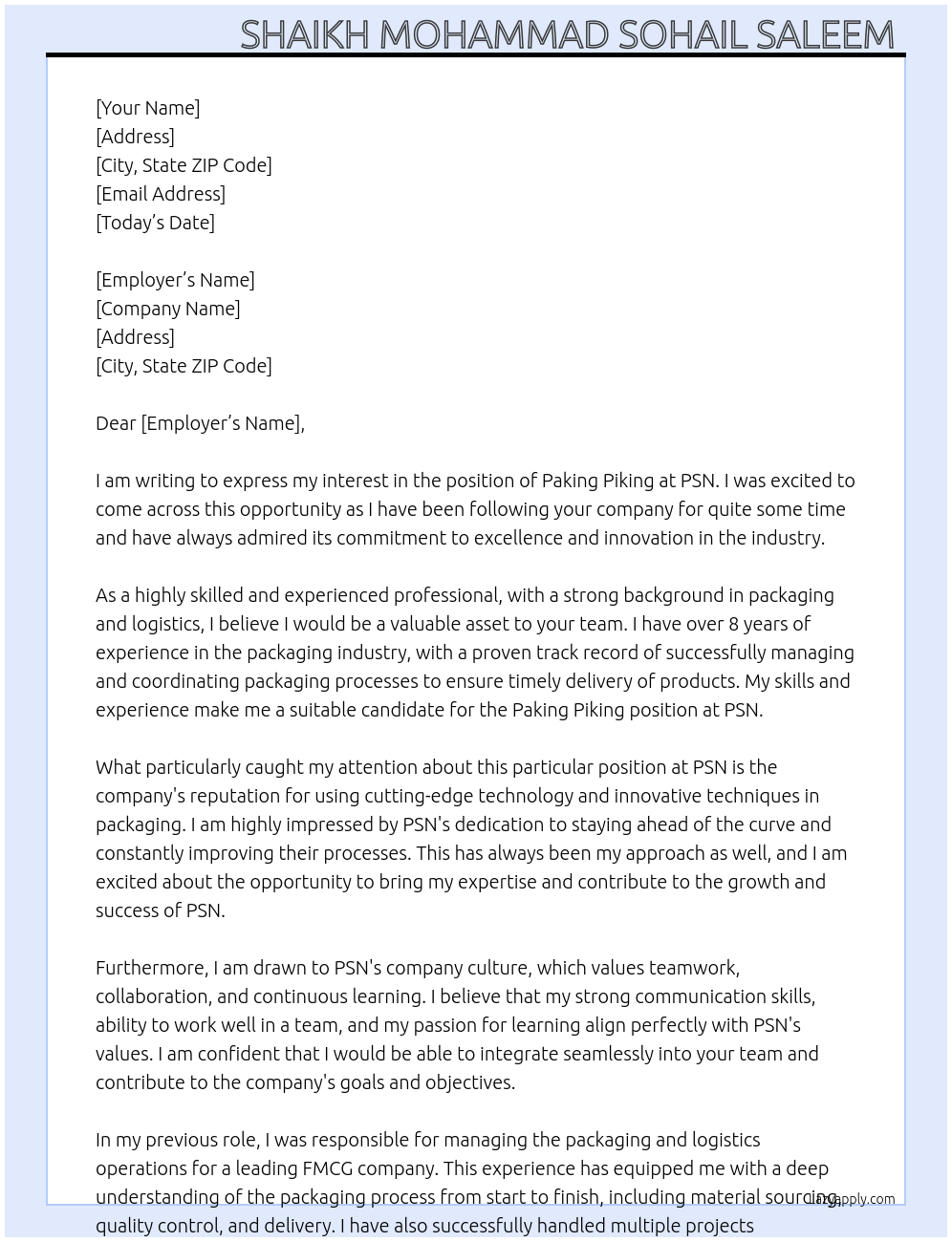 Check out these paking piking cover letter sample and examples previously used by job seekers to land on job interviews as paking piking. Use our AI cover letter generator to create a personalized cover letter as paking piking.