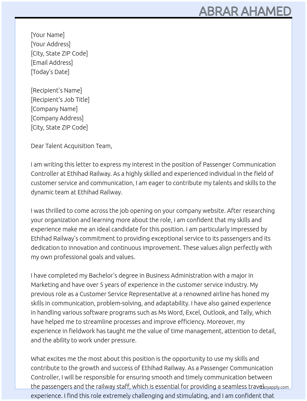 Passenger Communication controller Cover Letter At Ethihad Railway