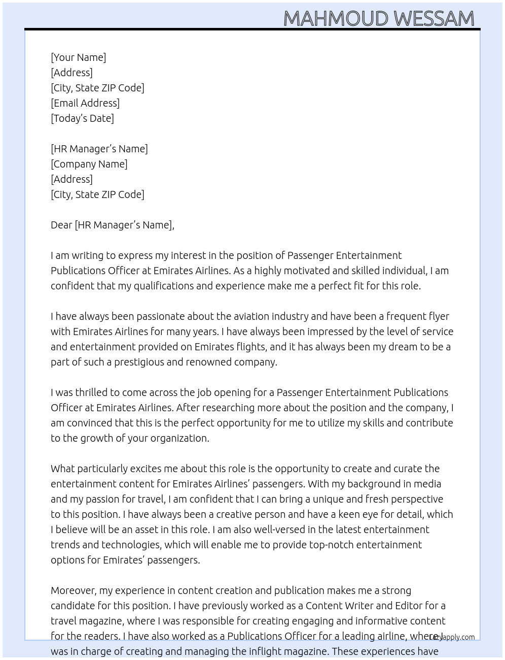 Passenger Entertainment Publications Officer Cover Letter At Emirates Airlines