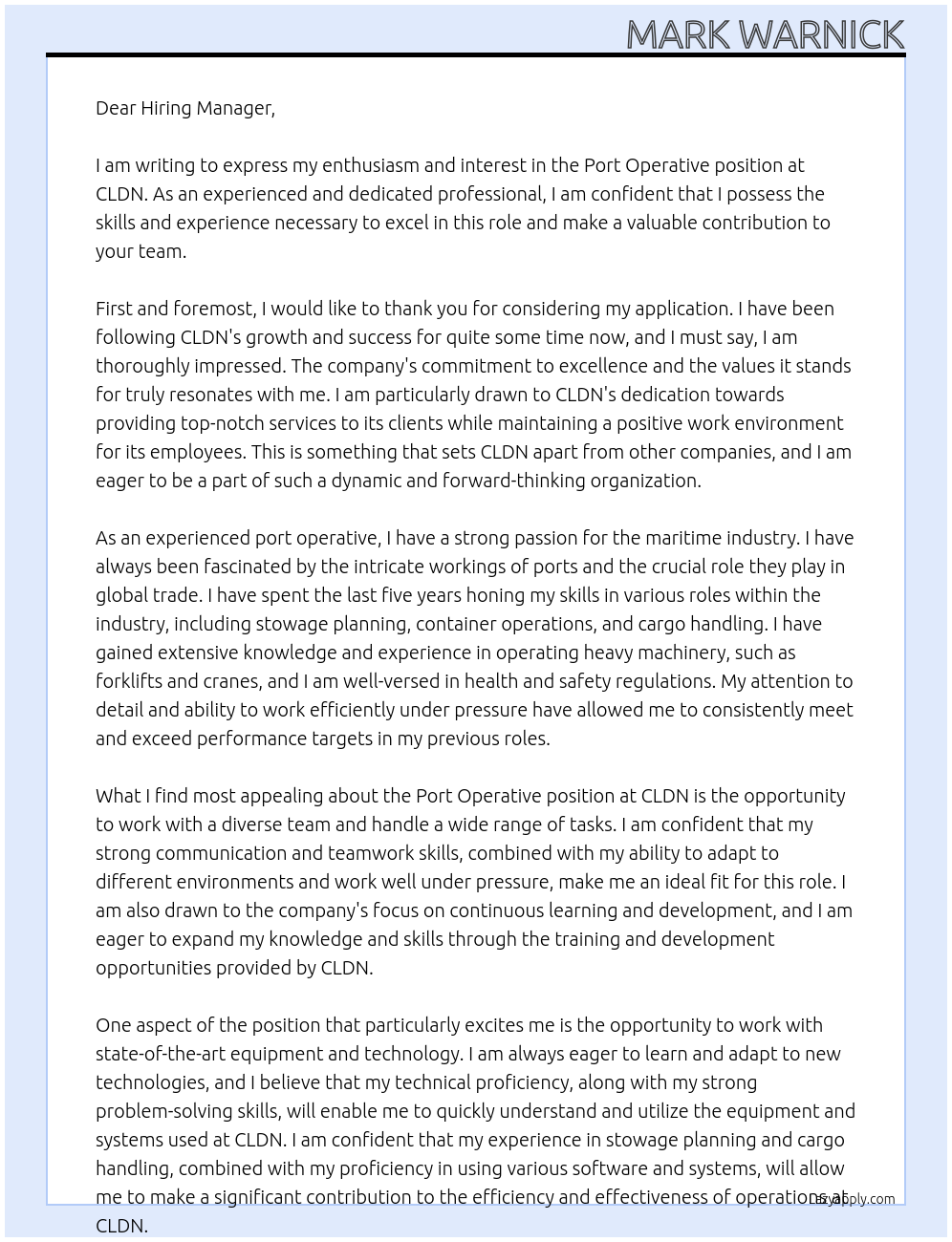Port Operative Cover Letter Examples