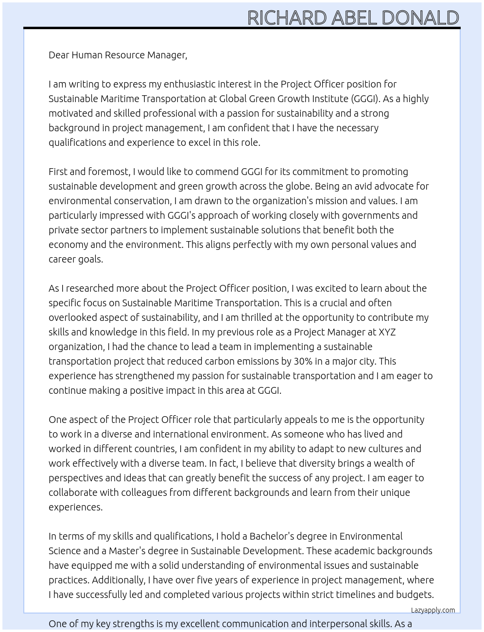 Project officer. Sustainable Maritime Transportation Cover Letter At GGGI