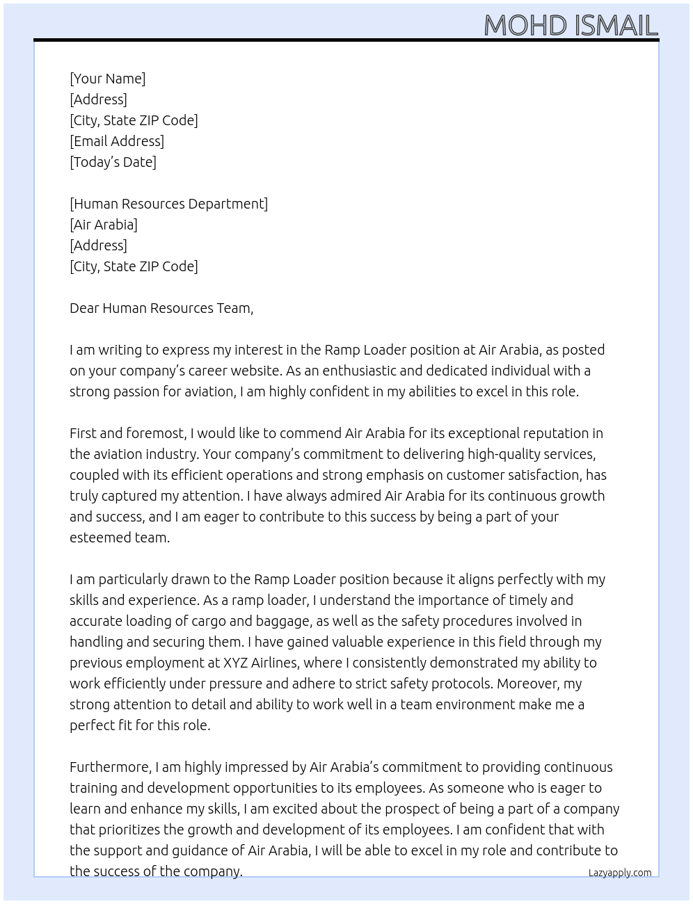 Check out these ramp loader cover letter sample and examples previously used by job seekers to land on job interviews as ramp loader. Use our AI cover letter generator to create a personalized cover letter as ramp loader.