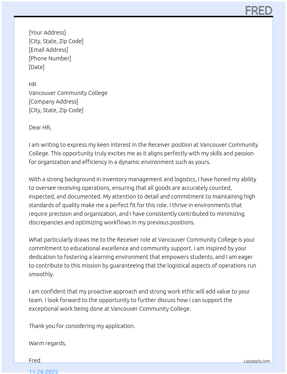 Reciever Cover Letter At Vancouver Community College