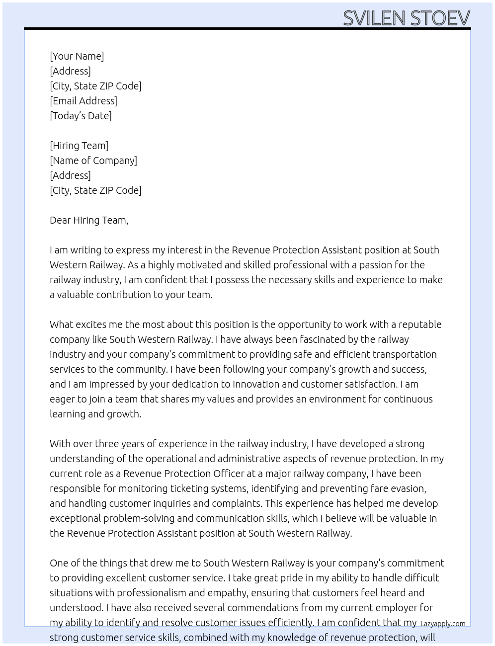 Revenue Protection Assistant Cover Letter At South Western Railway