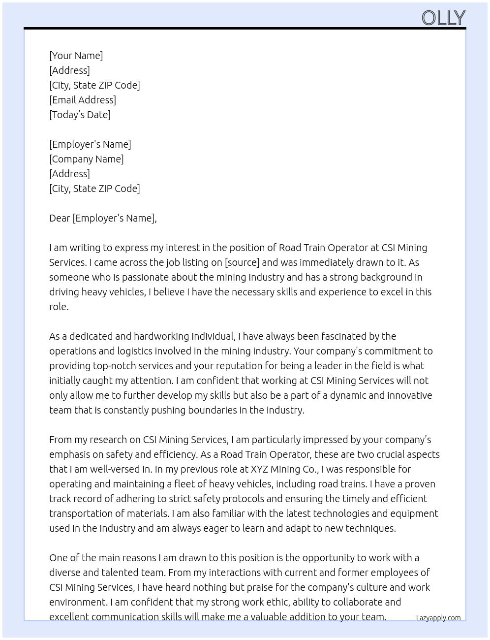 Road Train Operator Cover Letter Examples