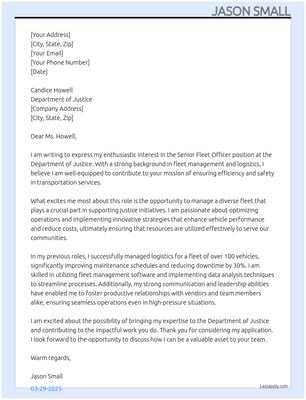 Check out these senior fleet officer cover letter sample and examples previously used by job seekers to land on job interviews as senior fleet officer. Use our AI cover letter generator to create a personalized cover letter as senior fleet officer.