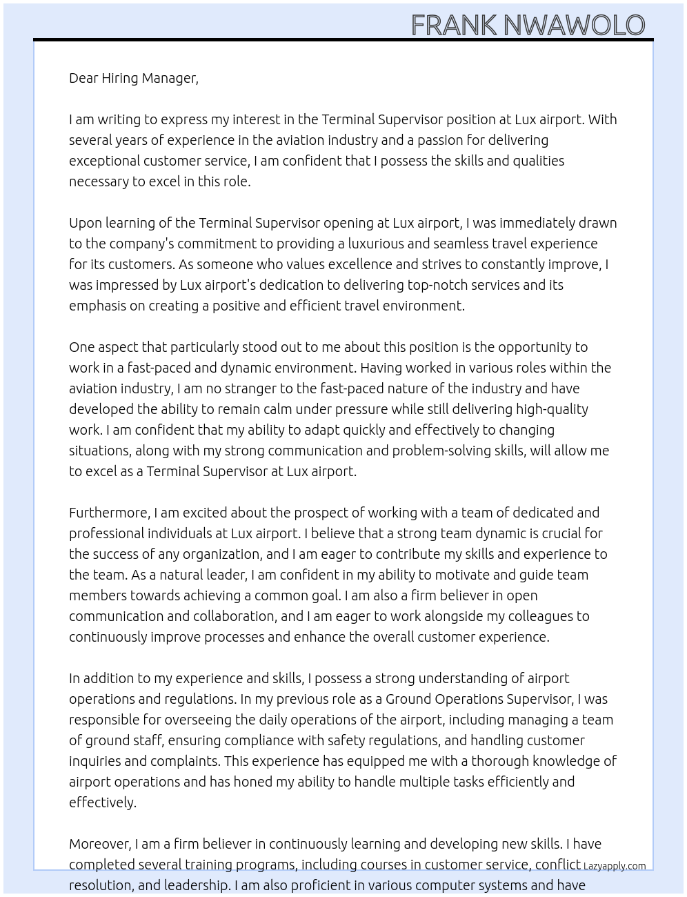 Check out these terminal supervisor cover letter sample and examples previously used by job seekers to land on job interviews as terminal supervisor. Use our AI cover letter generator to create a personalized cover letter as terminal supervisor.