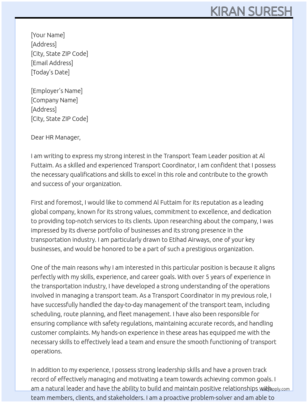 Check out these transport team leader cover letter sample and examples previously used by job seekers to land on job interviews as transport team leader. Use our AI cover letter generator to create a personalized cover letter as transport team leader.
