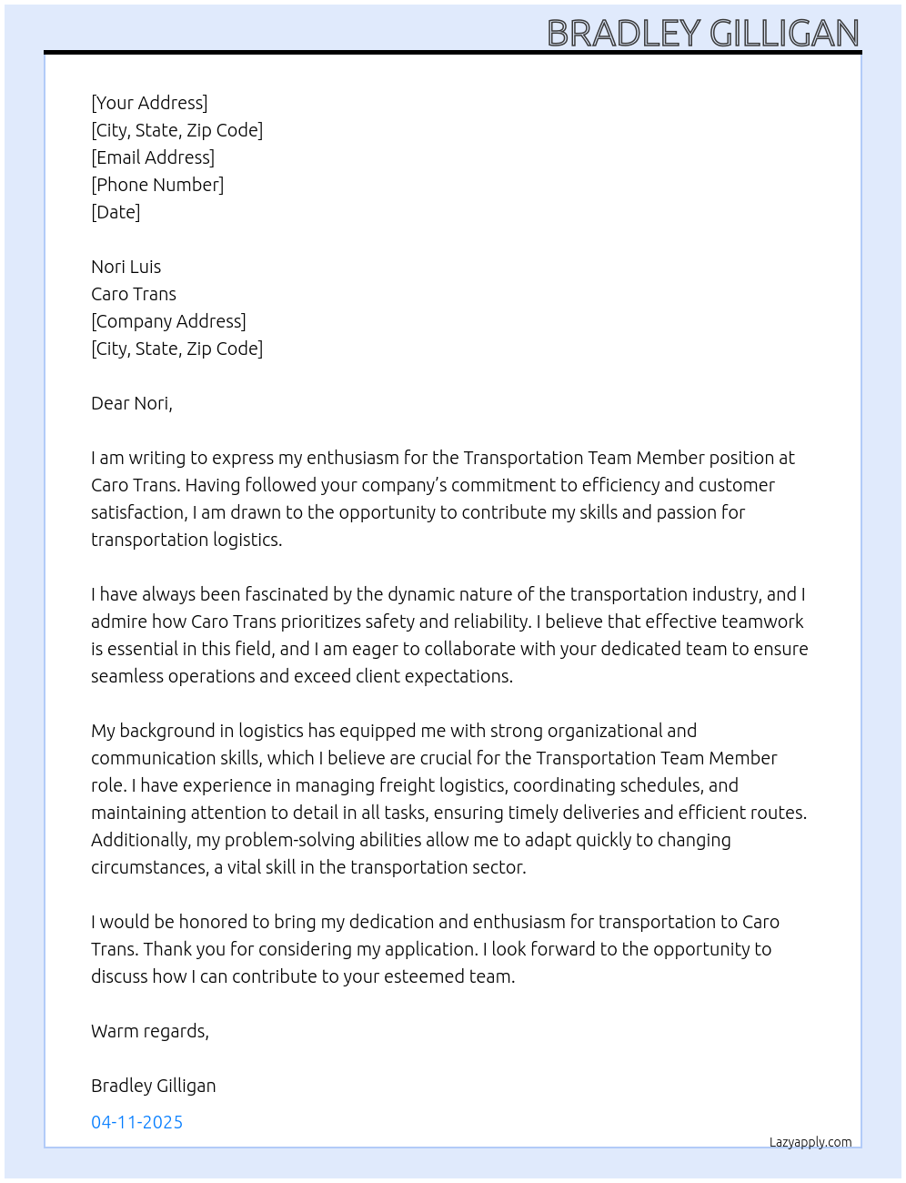 Check out these transportation team member cover letter sample and examples previously used by job seekers to land on job interviews as transportation team member. Use our AI cover letter generator to create a personalized cover letter as transportation team member.