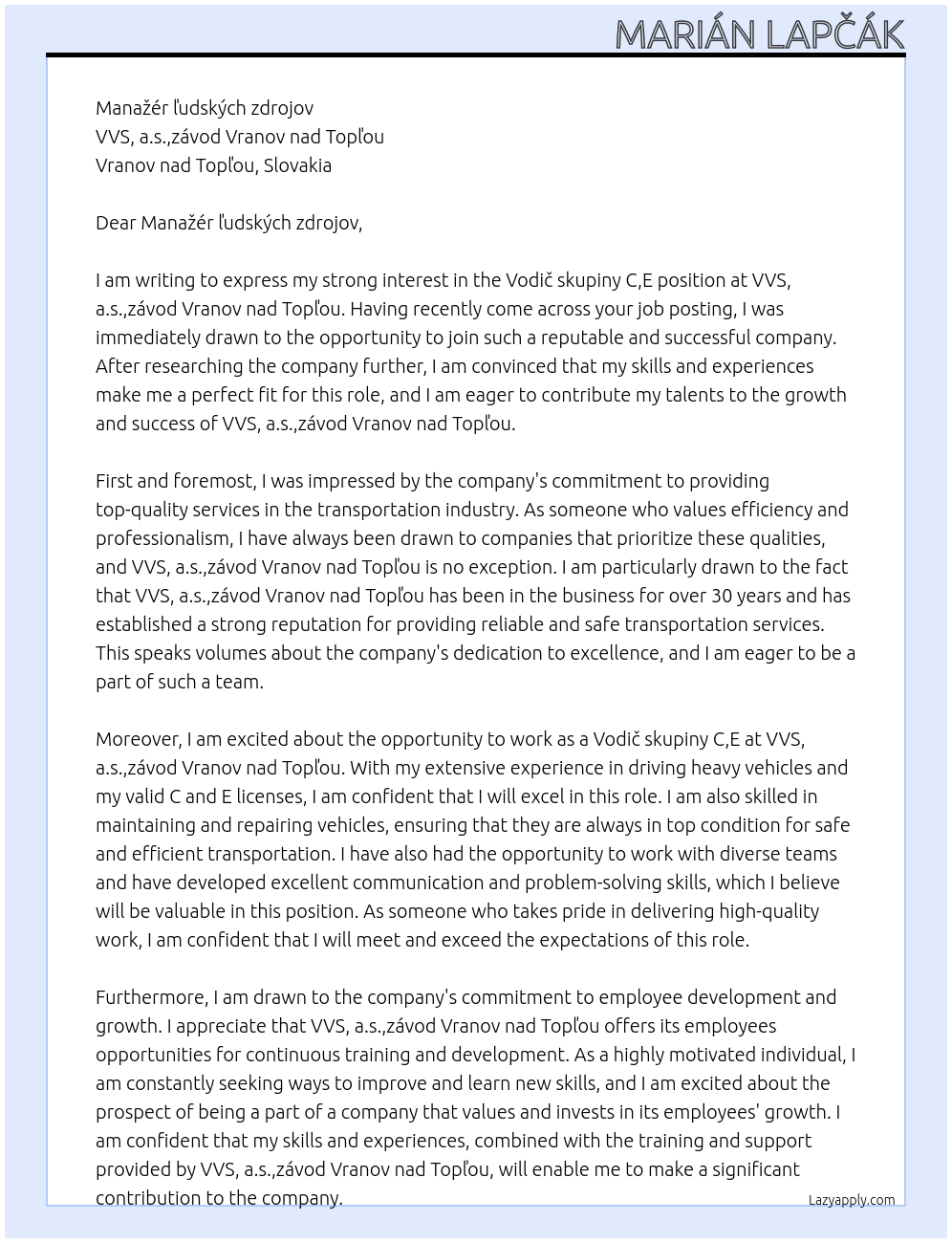 Vodič skupiny C,E Cover Letter At VVS, a.s.,závod Vranov nad Topľou