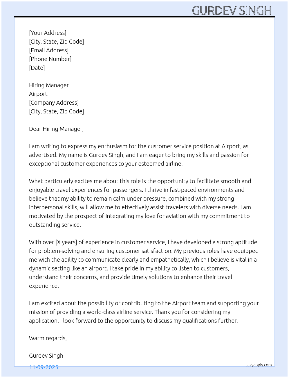 AIRLINE  At AIRLINE AIRPORT  Cover Letter