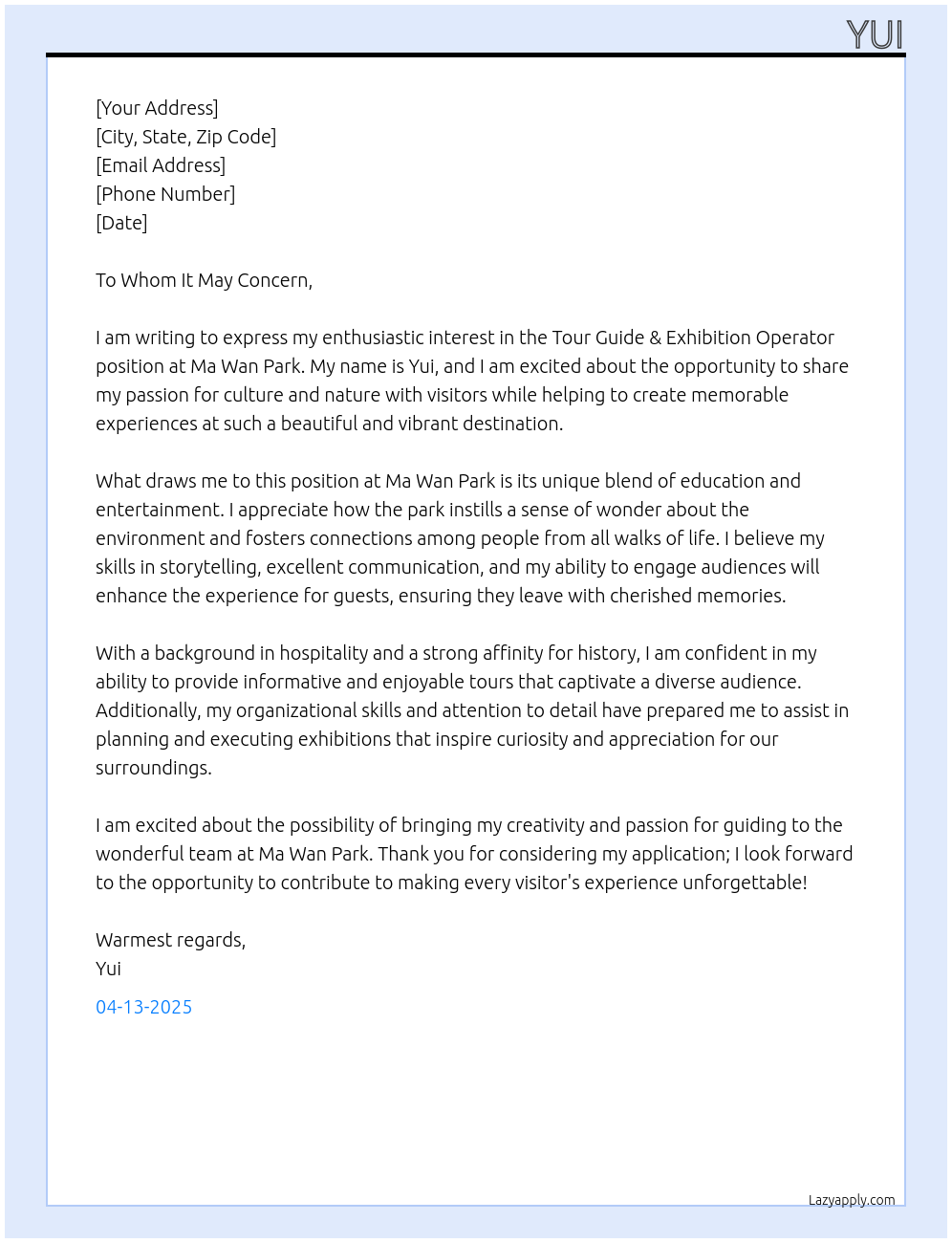 Check out these tour guide & exhibition operator cover letter sample and examples previously used by job seekers to land on job interviews as tour guide & exhibition operator. Use our AI cover letter generator to create a personalized cover letter as tour guide & exhibition operator.