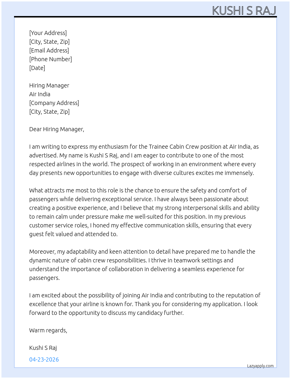 Check out these cabin crew cover letter sample and examples previously used by job seekers to land on job interviews as cabin crew. Use our AI cover letter generator to create a personalized cover letter as cabin crew.