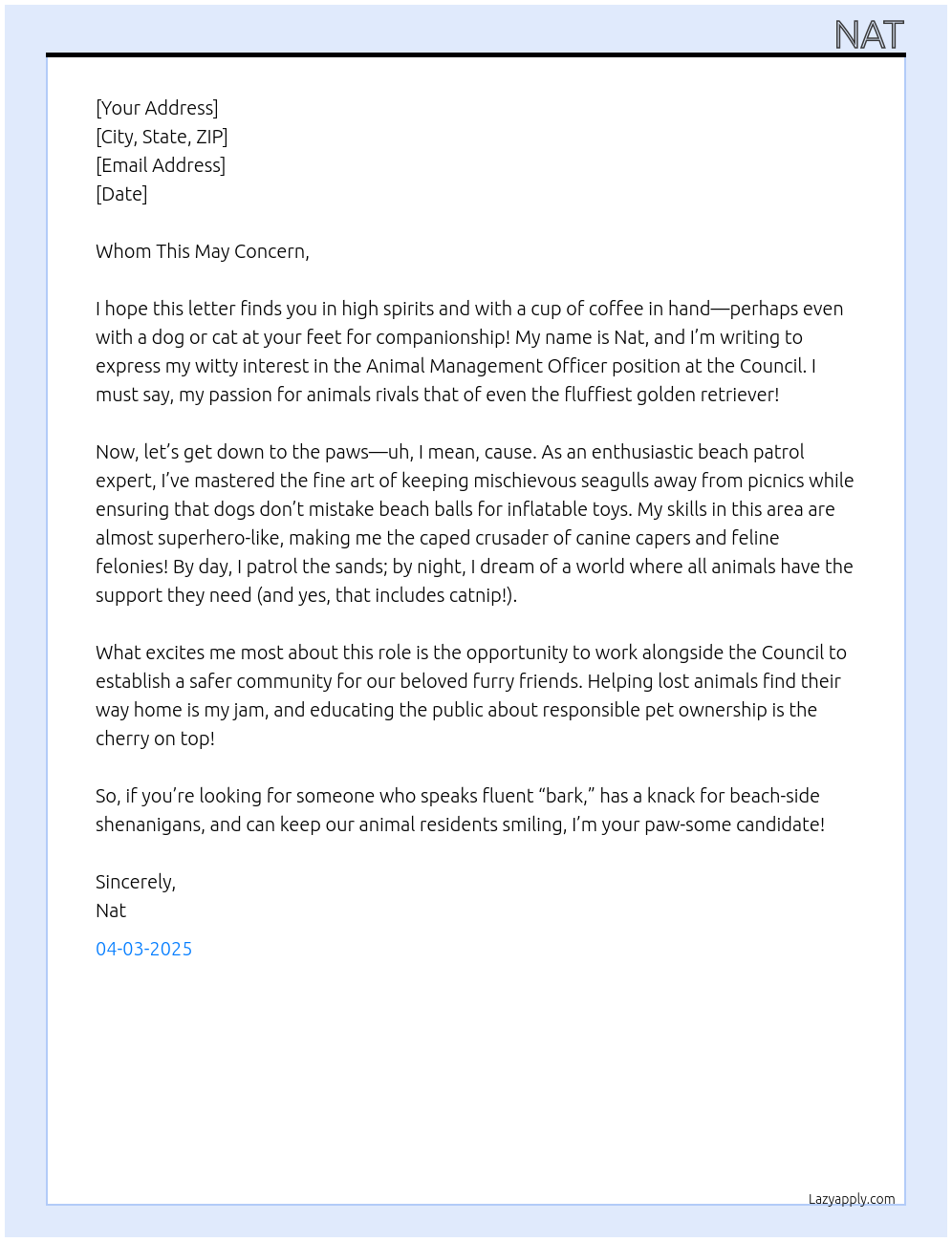 Check out these animal management officer cover letter sample and examples previously used by job seekers to land on job interviews as animal management officer. Use our AI cover letter generator to create a personalized cover letter as animal management officer.