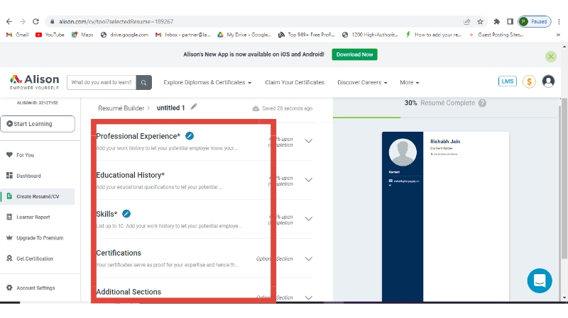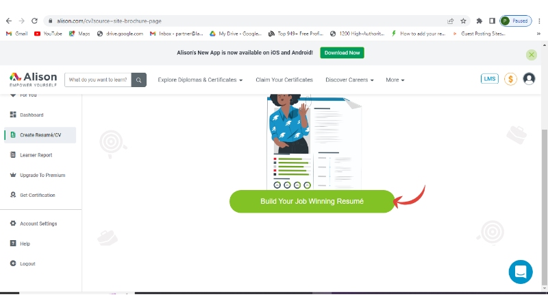 Alison is a course provider platform having higher education and diploma courses with over 30 million+ learners with positive feedback showing learners' satisfaction. It also offers a resume builder within its service.