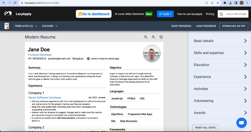 You do not need to spend time researching how to create a resume, what to include what not to. All this work an AI resume builder like LazyApply Resume Builder, Kickresume, Zety, etc. will do for you in minutes. You can customize an already existing resume or do it from scratch.