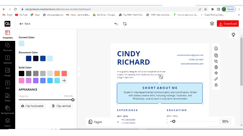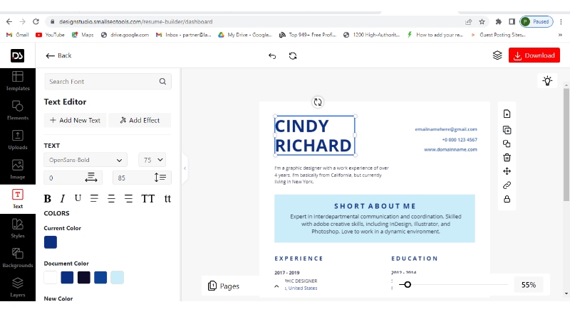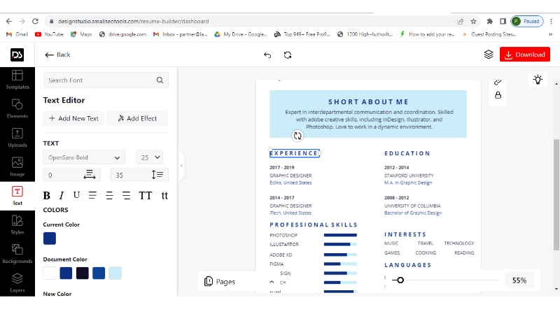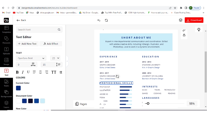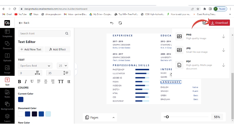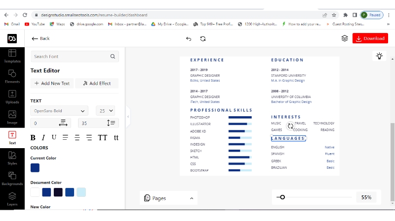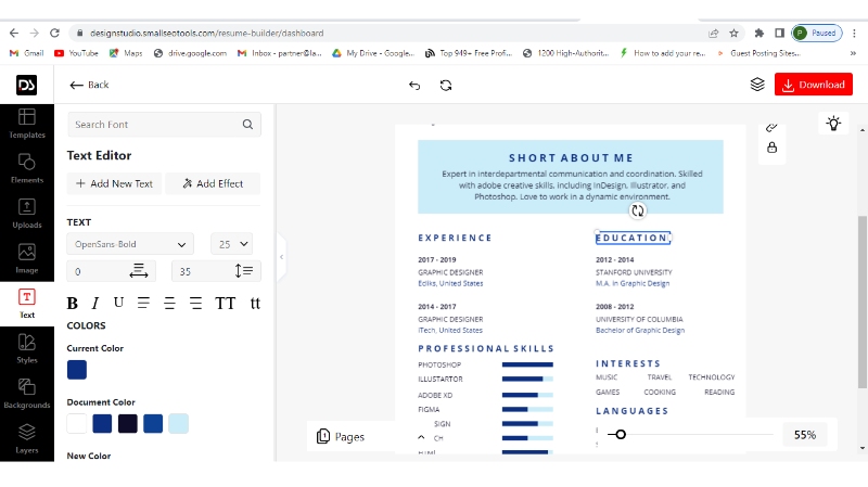 Design Studio's resume builder is a good resume builder with a very simple and easy-to-use interface having customized templates with modern styles, fonts, themes, backgrounds, layers, images, etc. Job seekers can create their resumes in just 3 minutes using Design Studio's resume builder. It is operated by smallseotools.