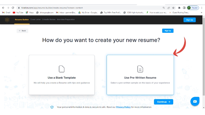 Step 3: Click on Use a Pre-Written Resume and Continue
