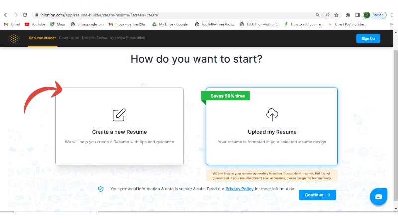 Step 2: Now select Create a New Resume and Continue