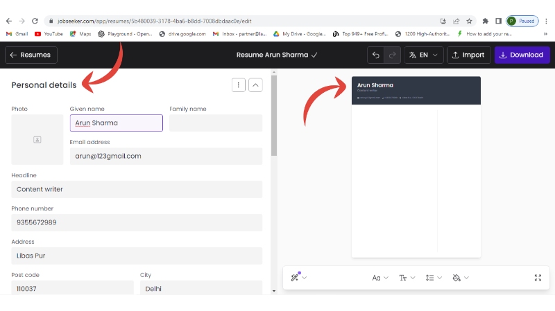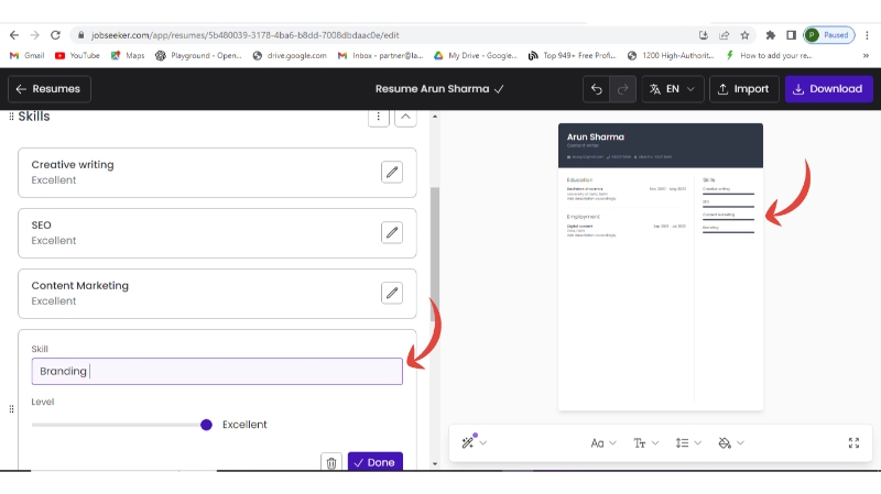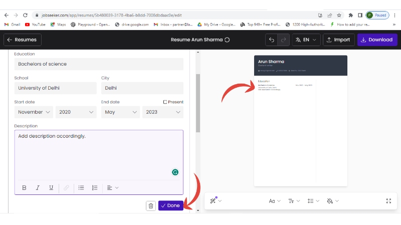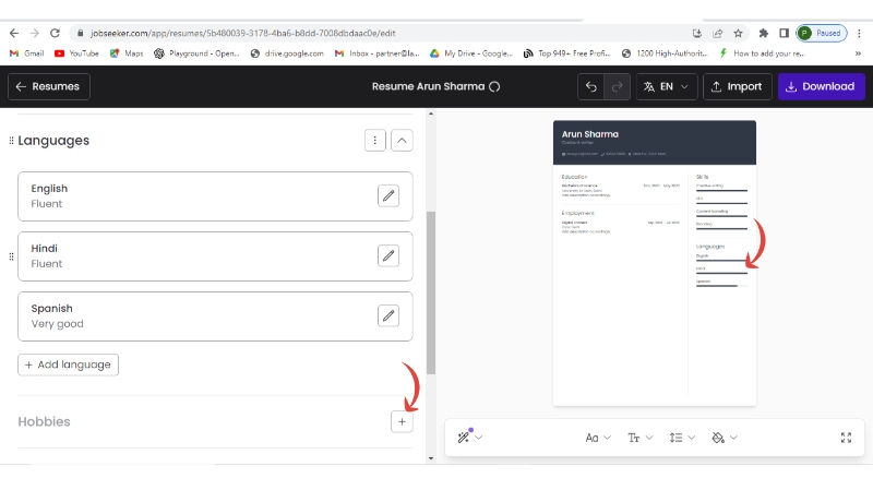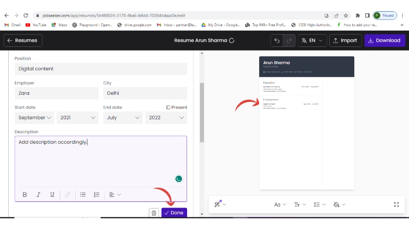 - You can parallelly see the changes in your final resume