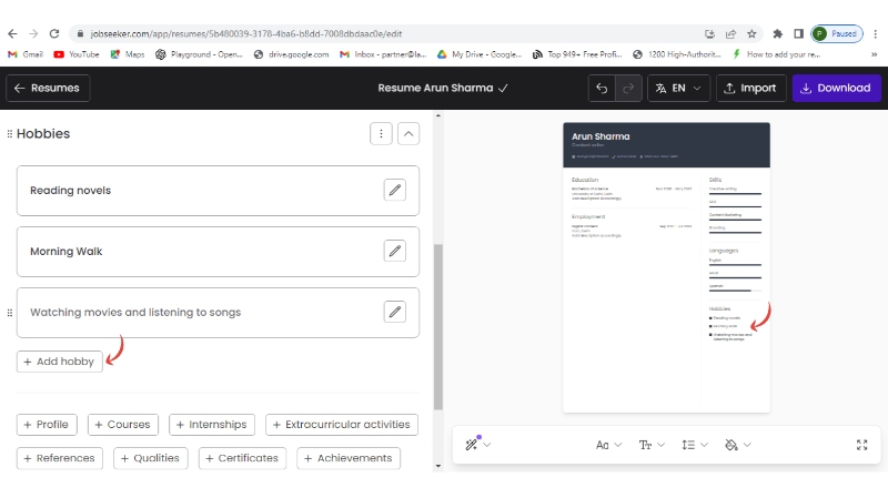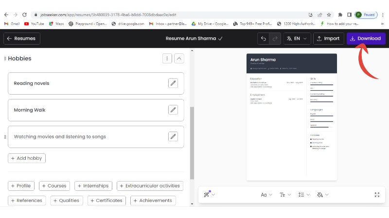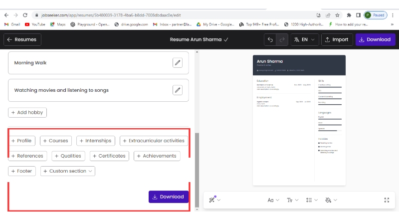 Step 9: Either add more sections like profile, achievements, etc., or continue to download your resume