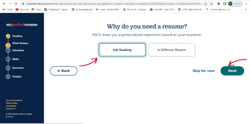 Step 8: Select "JOB SEEKING" and continue