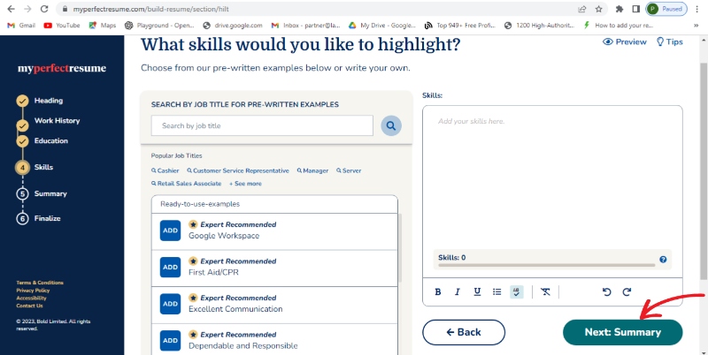 Step 11: Mention your skill set and click on next