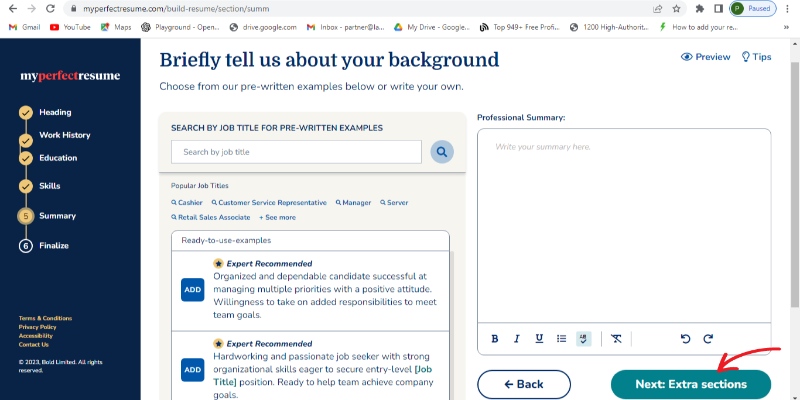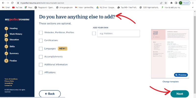 Step 13: Now if you want to add any extra section then click add extra section otherwise finalize your resume