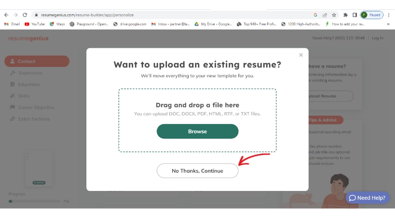 Step 5: Now select template and color, a pop-up window will appear asking either to upload your existing resume or to continue