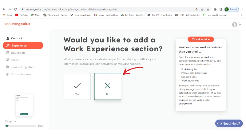Step 8: Now it would ask whether you want to add a work experience section or not. So, as a fresher select no