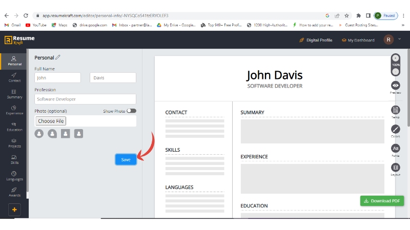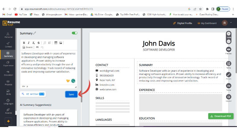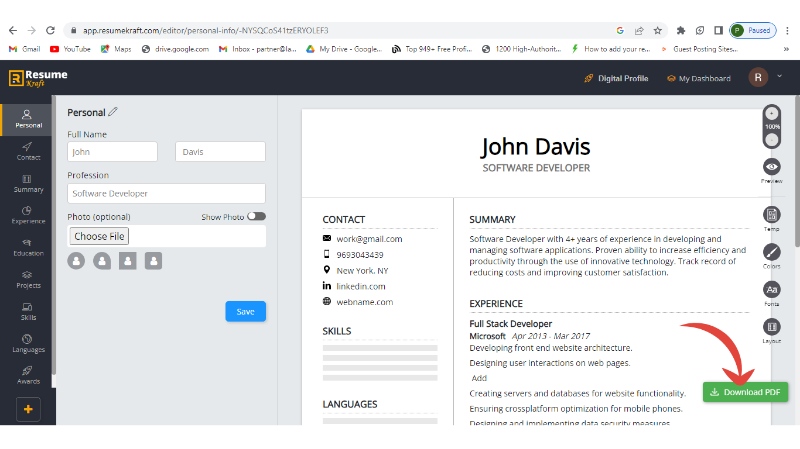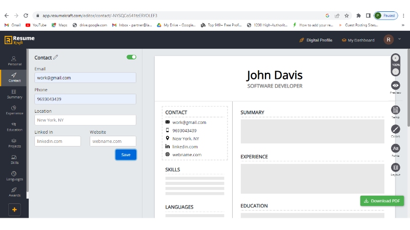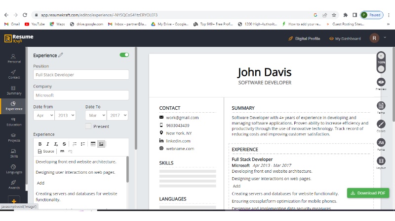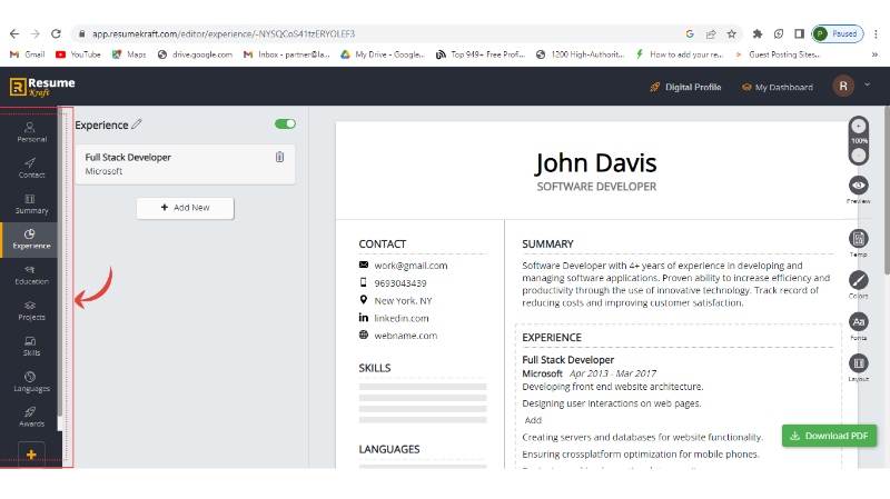 Step 6: Add all the sections like education, projects, skills, etc. in the same manner, and once added them, download your resume