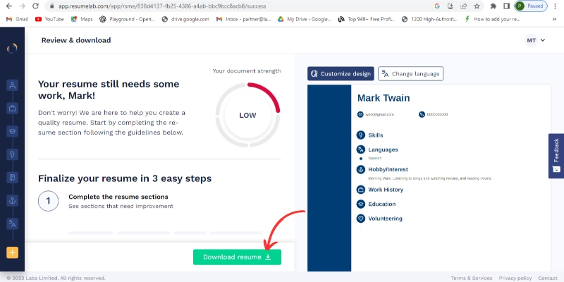 Step 15: It will tell you, your resume score automatically and based on your score you can modify it and download it