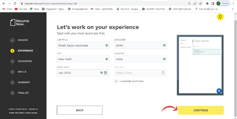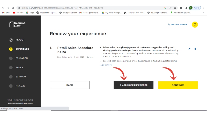 Step 9: If you want to add more experience then select Add more otherwise continue to next