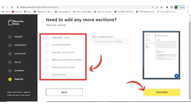 Step 13: Add any other additional sections otherwise continue and finalize your resume